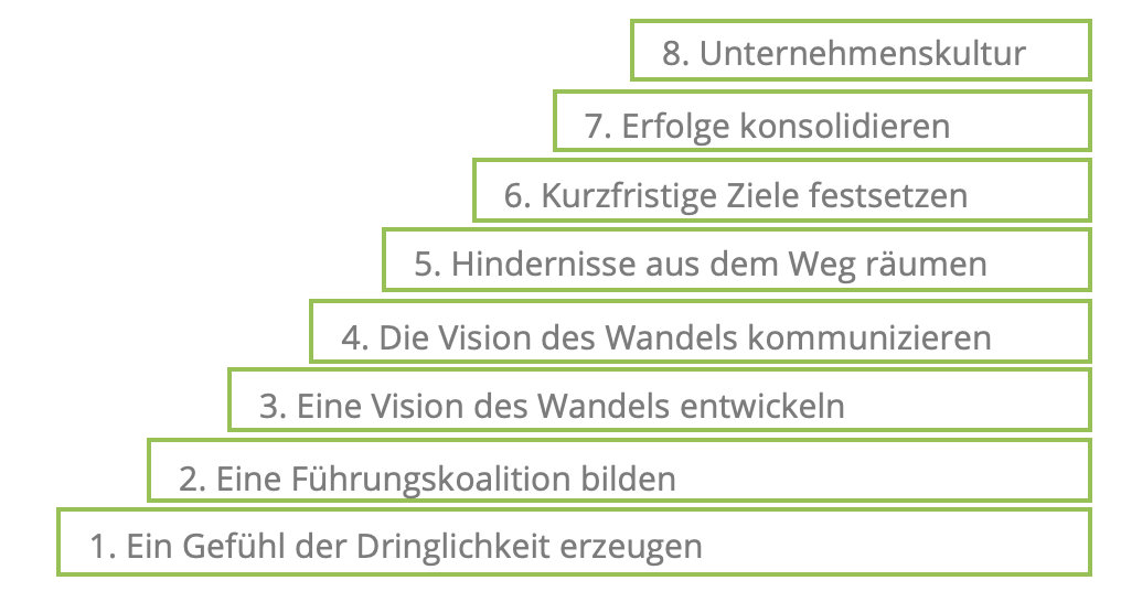 Viele Unternehmen rufen große Projekte im Bereich der Prozessoptimierung und der Digitalisierung aus und geraten immer wieder ins Stocken oder scheitern ganz. Das 8-Stufen-Modell von Kotter kann helfen, die Situation einzuordnen und Entwicklungsmöglichkeiten aufzuzeigen. Die Basis tiefgreifender Veränderungen liegt in der Dringlichkeit. Ist die Situation der Dringlichkeit nicht allen Beteiligten bewusst, werden diese nie die nötige Motivation aufbringen, tiefgreifende Veränderungen aktiv mitzugestalten. Im nächsten Schritt muss ein schlagkräftiges Team zusammengestellt werden, das genügend Macht, Kompetenz und Überzeugung besitzt, die Veränderungen voranzutreiben. Die Macht einer richtungsweisenden Vision und deren Kommunikation ist nicht zu unterschätzen. Dabei werden Kennzahlen erarbeitet, Zielerreichungsgrade festgelegt und Maßnahmen abgeleitet. Zudem sollten die Maßnahmen in kleine, agile Sprints zerlegt werden. Etwaige Hindernisse müssen erkannt und beseitigt werden. Die Mitarbeiter müssen auf breiter Basis befähigt werden, um schnelle und sichtbare Erfolge zu erzielen. Diese helfen dann, die Motivation und Identifikation der Mitarbeiter aufzubauen. Erst mit den ersten sechs Schritten legt man die Grundsteine für nachhaltige und tiefgreifende Veränderungen. Ab jetzt gilt es, das gewonnene Vertrauen und die Motivation zu nutzen, um die Veränderungen im Sinne der Vision umzusetzen, bis Veränderungen zur Normalität werden.